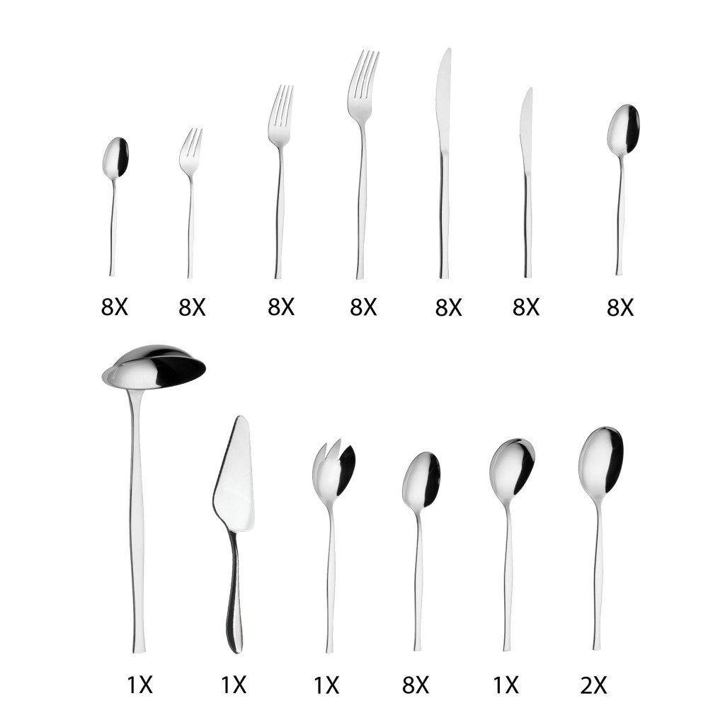 Készlet tartalma: 8 db étkező kés 5,0 mm. 8 db étkező villa 2,5 mm. 8 db étkező kanál 2,5 mm. 8 db desszertkanál 2,5 mm. 8 db teás kanál 2 mm. 1 db saláta kanál 2,5 mm. 2 db szervízkanál 2,5 mm. 8 db desszertvilla 2,5 mm. 8 db tortavilla 2,0 mm. 1 db salátavilla 2,5 mm. 8 db desszertkés 4,0 mm. 1 db tálaló kanál tortához 2,5 mm. 1 db mártáskanál 2,5 mm. Anyaga: Rozsdamentes acél. Szín: Rozsdamentes acél.