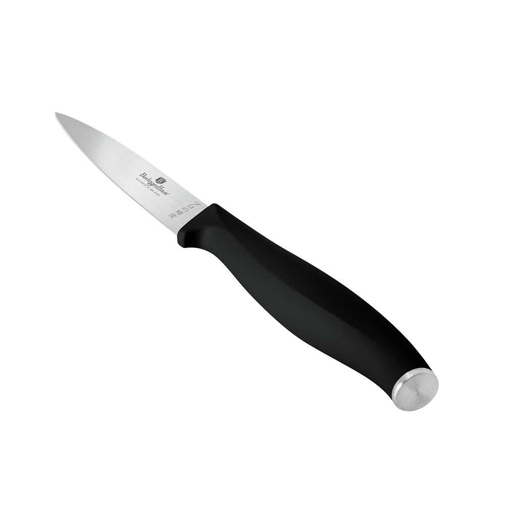 A hámozókés a Matte Black Collection része, amely a modern konyhák elengedhetetlen eszköze. Ez a konyhai kés nemcsak a funkcionalitásával, hanem a stílusával is lenyűgöz, hiszen a kollekció minden darabja egységes, elegáns megjelenést biztosít, így bátran kihelyezhetők a konyhapultra, nem kell őket a fiók mélyére rejteni. A kés kiváló minőségű rozsdamentes acélból készült, amely tartósságot és hosszú élettartamot biztosít. A hőkezelési eljárással készült penge garantálja a precíz vágást és a könnyű használatot. A 9 cm-es penge ideális méretű a mindennapi konyhai feladatokhoz, legyen szó zöldségek, gyümölcsök hámozásáról vagy apróbb vágási feladatokról. A fekete szín elegáns és modern megjelenést kölcsönöz a késnek, amely tökéletesen illeszkedik a Matte Black Collection többi darabjához. Az ergonomikus, puha tapintású fogantyú kényelmes és biztonságos fogást biztosít, így a hosszabb használat során sem fárad el a kéz. Az ujjvédelemmel ellátott kialakítás további biztonságot nyújt a használat során. A kézi élezésnek köszönhetően a penge rendkívül éles, ami megkönnyíti a pontos és gyors munkavégzést a konyhában. Élvezd a precíz vágás élményét és a konyhai munka könnyedségét ezzel a kiváló minőségű késsel.