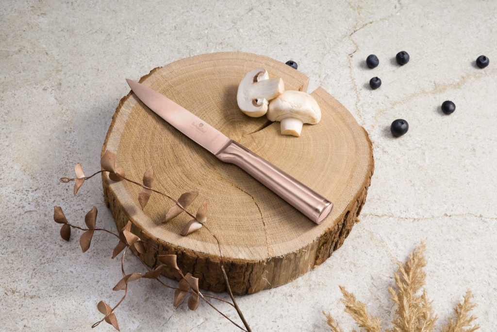 A Taupe Collection részeként az általános kés nemcsak egy konyhai eszköz, hanem egy stílusos kiegészítő is, amely bármelyik konyhában megállja a helyét. Ez a kés a rozsdamentes acél szatén és tükörfényű fogantyújával nemcsak a funkcionalitás, hanem az esztétika terén is kiemelkedő. A kés kiváló minőségű rozsdamentes acélból készült, amely tartósságot és hosszú élettartamot biztosít. A szatén és tükörfényű fogantyú elegáns megjelenést kölcsönöz, miközben kényelmes fogást biztosít. A 12,5 cm-es penge ideális méretű a mindennapi konyhai feladatokhoz, legyen szó zöldségek aprításáról vagy húsok szeleteléséről. A rose gold színű fogantyú modern és elegáns megjelenést biztosít, amely bármely konyhai dekorációval harmonizál. A hőkezelési eljárással készült penge éles és tartós, így könnyedén megbirkózik a legkeményebb alapanyagokkal is. A kézi élezés biztosítja a precíz vágást minden használat során. Az ujjvédelemmel ellátott kialakítás extra biztonságot nyújt, így a vágás során kevesebb az esélye a baleseteknek. A Taupe Collection konyhai eszközei nemcsak funkcionálisak, hanem esztétikusak is, így bátran kihelyezhetők a konyhapultra, nem kell őket a fiók mélyére rejteni.