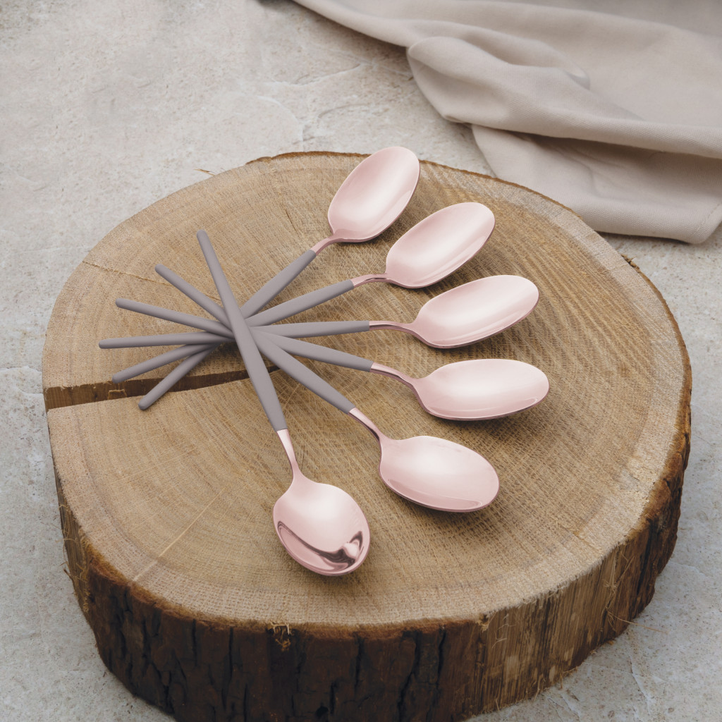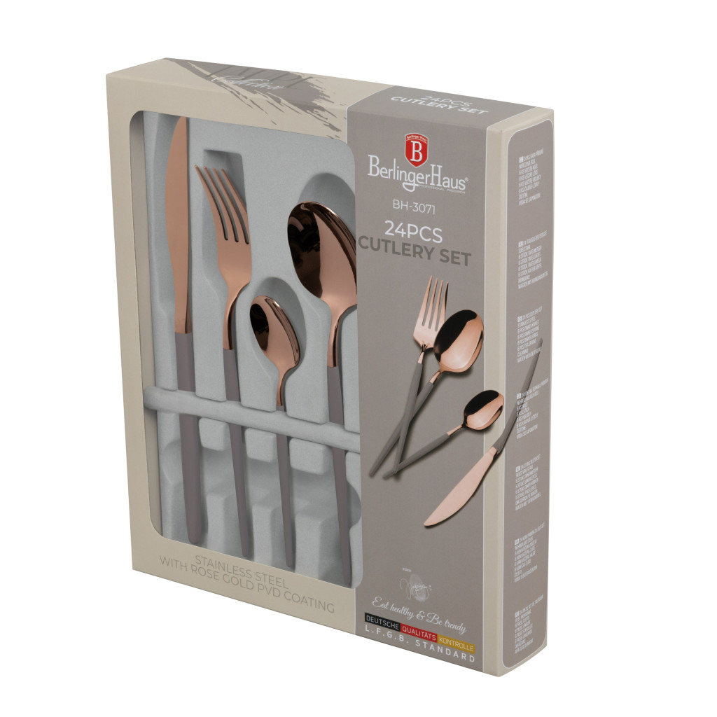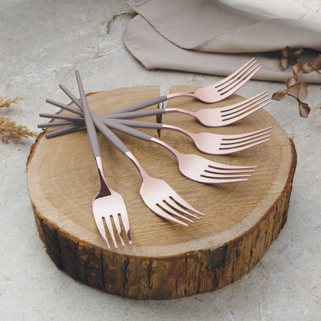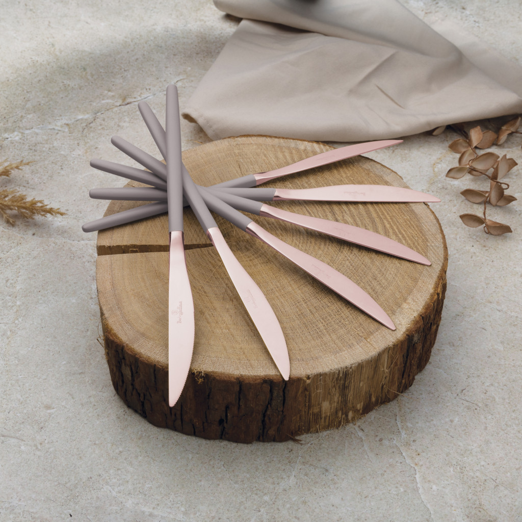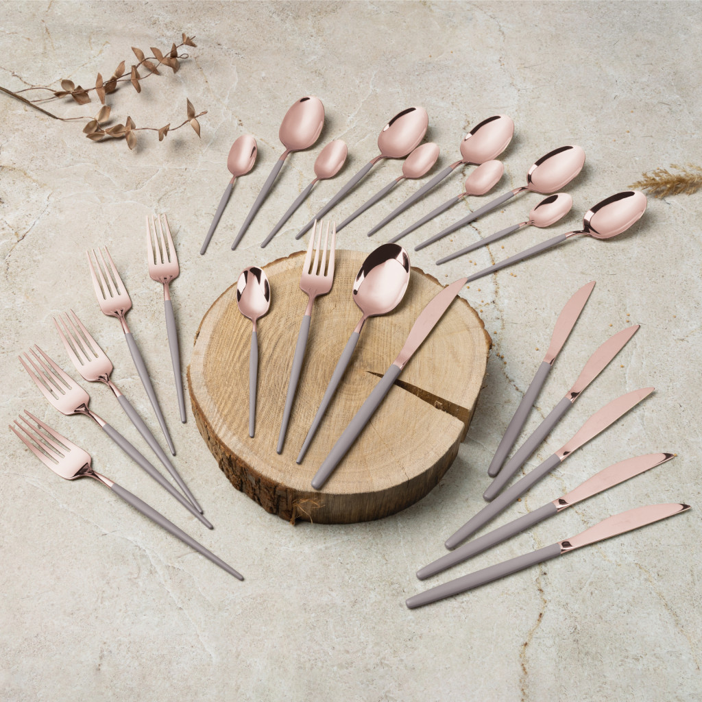 A 24 részes evőeszköz készlet a Taupe Collection része, amely a modern konyhák elengedhetetlen kiegészítője. Ez a kollekció nemcsak funkcionális, hanem esztétikailag is lenyűgöző, így az evőeszközök nem csak a fiókban rejtőznek, hanem büszkén ki is állíthatók. A készlet rozsdamentes acélból készült, pezsgő PVD bevonattal és matt nyéllel, amely nemcsak tartósságot, hanem eleganciát is kölcsönöz az evőeszközöknek. A taupe-rose gold színkombináció különleges pezsgő megjelenést biztosít, amely a matt nyéllel párosítva elegáns és modern megjelenést kölcsönöz az evőeszközöknek. Az evőeszközök kiváló minőségű rozsdamentes acélból készültek, rose gold PVD bevonattal, amely nemcsak a tartósságot, hanem a stílust is garantálja. Az egyedi csomagolás pedig tökéletes ajándékká teszi ezt a készletet. A Taupe Collection evőeszközei nemcsak a mindennapi használatra ideálisak, hanem különleges alkalmakra is tökéletes választás. Az elegáns kivitelezés és a különleges színkombináció minden étkezést emlékezetessé tesz. Ez a 24 részes evőeszköz készlet a Taupe Collection részeként nemcsak a konyhában, hanem az étkezőasztalon is megállja a helyét.