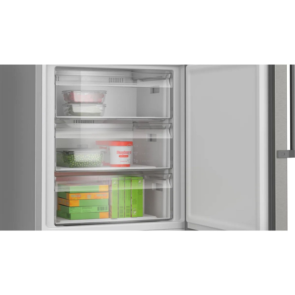 Esztétikai sérült termék! A tágas VitaFresh XXL 0°C rendszer ideális tárolási feltételeket kínál ételeid számára. A hőmérsékletet alacsonyabb fokon tartja a hús és hal esetén, a hűtésvezérelt fiók pedig valóban frissen tartja a zöldséget és a gyümölcsöt. Felejtsd el a leolvasztással járó vesződést! A NoFrost egyenletes száraz levegőáramlást biztosít a hűtőszekrényben, ami megakadályozza a jég felhalmozódását. Vége a jégkorszaknak, a leolvasztással járó vesződség már a múlté. Hűtődben az egyenletlen hőmérséklet nagyban befolyásolhatja az ételek ízét és szavatosságát. A MultiAirflow-val rendelkező fényes hátfalnak köszönhetően a páratartalom és a hőmérséklet egyenletes eloszlású a hűtőtérben az ajtórekeszektől a hátsó sarkokig. Így ételeid tovább maradnak épen. Hűtőd korlátok nélkül helyezheted el. A két oldalfal teljes felületén jelen lévő modern és egyedülálló kondenzációs technológiának köszönhetően hűtőszekrényed megkötés nélkül helyezheted el, hiszen a készülék külső felületén nem jelentkezik páralecsapódás. A vitaminok, tápérték, megjelenés és íz megőrzése érdekében az ételeket a lehető leggyorsabban kell lefagyasztani. Az automatikus szuperfagyasztás funkcióval gyorsabban lefagyaszthatod a kisebb mennyiségű ételt, miközben megvédi a fagyasztott élelmiszereket a kiolvadástól. A fagyasztó érzékeli a hőmérséklet növekedését, és automatikusan változtatja annak hőmérsékletét a legjobb tárolási feltételek garantálása érdekében. A LED világítás teljesen új koncepciót hoz a hűtőszekrények megvilágításába, egyenletes, káprázás mentes belső világítást garantál. A LED világítás kevesebb villamos energiát fogyaszt, mint a hagyományos hűtőszekrény világítások, és kitart a készülék élettartamának végéig.