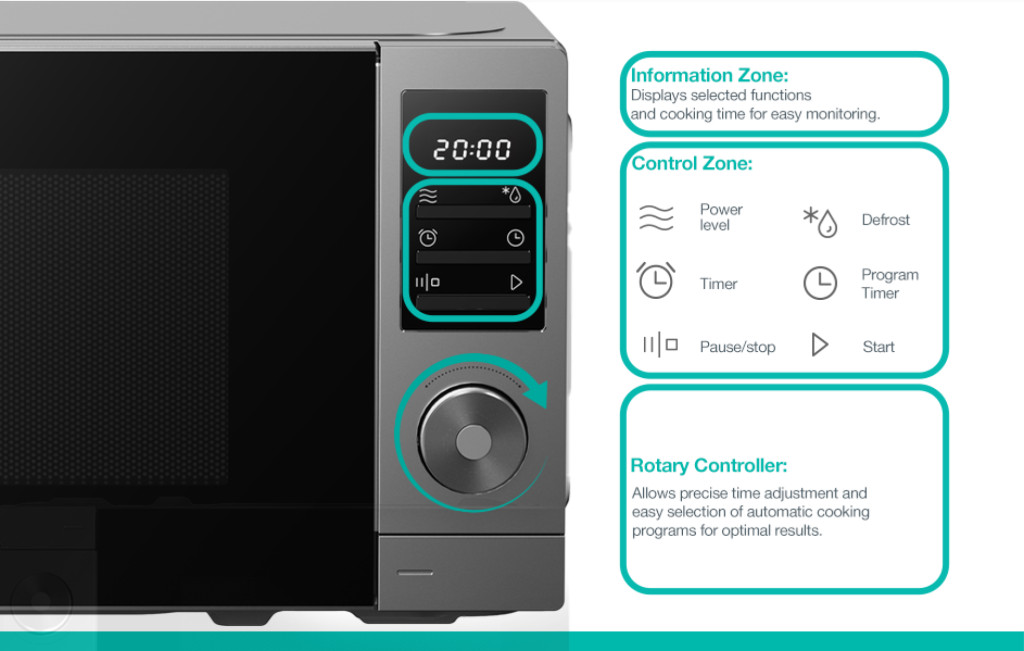 A sütő belseje könnyedén tisztítható. Tölts meg egy hőálló üvegből készült bögrét vagy poharat vízzel ó tedd be a mikrosütőbe, és indítsd el az AutoClean programot. A keletkező gőz fellágyítja a sütő falain lévő szennyeződéseket. A program végén egyszerűen töröld kia sütőt egy nedves ruhával. 360°-ban forgó tányér az ételek tökéletesen megfőzhetőek vagy melegíthetők anélkül, hogy az étel bizonyos pontokon hideg maradjon. A forgótányér állandó forgása lehetővé teszi, hogy a mikrohullámok hatékonyan és egyenletesen melegítsék az elkészítendő ételeket. A forgótányér az optimális kiolvasztáshoz is elengedhetetlen.