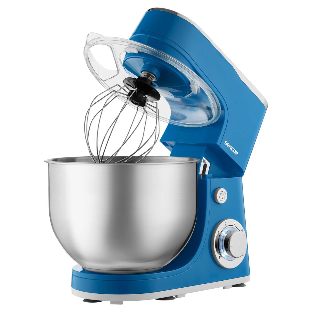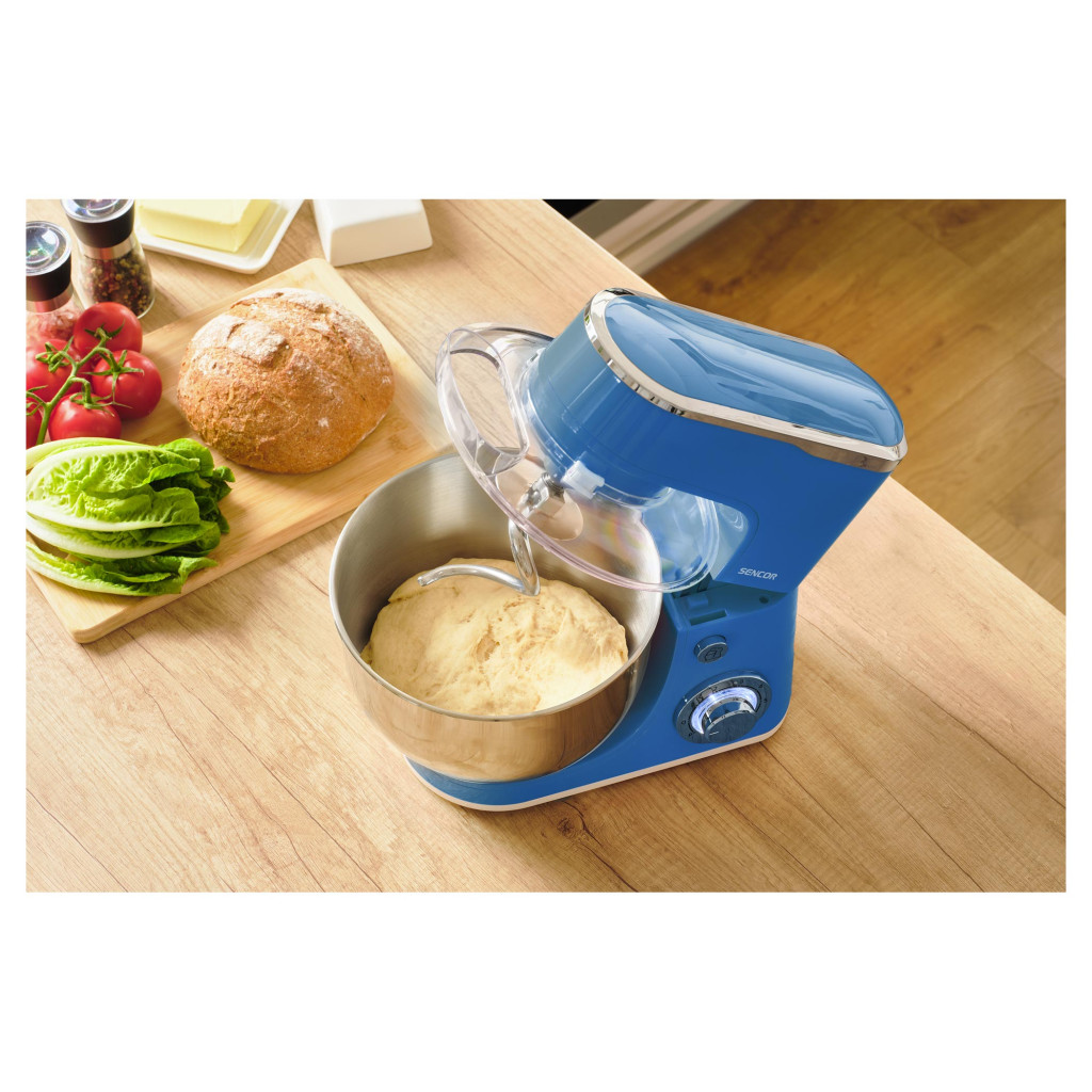 Teljesítmény: 1300 W. Anyag: Rozsdamentes acél és műanyag. 6 sebesség fokozat+ Pulse. 5,5 literes rozsdamentes acél edény. 3 cserélhető tartozék: Ballonos habverő. Dagasztó horog. Habverő. Fröccsenésgátló fedél. Szín: Kék.
