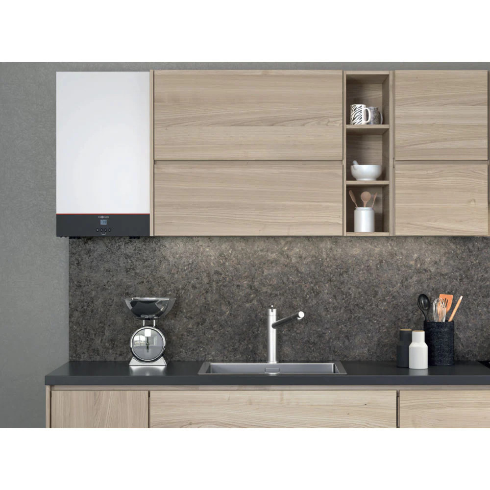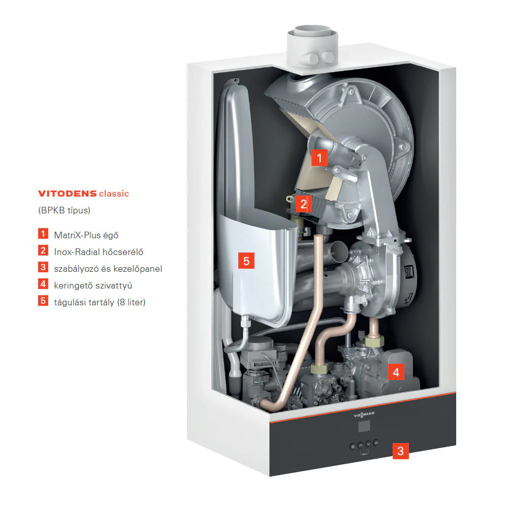 A falra szerelhető Viessmann Vitodens Classic kondenzációs kombi gázkazánnal egyszerre biztosíthatod otthonod fűtését és melegvíz-ellátását is. Rendkívül helytakarékos, akár kis beugrókba is felszerelhető. Felszerelésekor nincs szükség oldalsó szerviztávolság tartására, mivel minden részegység könnyedén hozzáférhető elölről. A saválló nemesacél Inox-Radial hőcserélő tartós és hatékony működést biztosít, míg a MatriX-Plus gázégő gondoskodik a csendes üzemről és az alacsony károsanyag-kibocsátásról. A speciális nemesacél MatriX felület ellenáll a magas hőmérsékletnek, magas teljesítményt és hosszú élettartamot garantál. LCD kijelzőjének és gombjainak köszönhetően egyszerűen beállítható a fűtési előremenő, illetve a HMV hőmérséklet. Az üzemállapotok és az azokhoz tartozó hőmérsékletek a kijelzőn könnyedén leolvashatók. Ideális megoldást jelent felújítások, illetve újépítésű házak esetén is. Időjárás függvényében vezérelt vagy állandó kazánvíz-hőmérsékletű üzemmód. Gyárilag földgázzal történő üzemre van beállítva, azonban legfeljebb 20 térfogatszázalékos hidrogén-hozzákeveréssel történő üzemeltetésre is alkalmas. A fagyvédelmi funkció csak csatlakoztatott külső hőmérséklet-érzékelő esetén lehetséges. Energiatakarékos keringető szivattyúval és 8 literes tágulási tartállyal szerelt. Fehér háttérvilágítású LCD kijelzője és 4 gombja egyszerű használatot biztosít. Fordulatszám szabályozású ventilátorral ellátott. Csatlakozásra készen csövezett és huzalozott. Alacsony károsanyag-kibocsátás jellemzi. Minden részegység hozzáférhető elölről. Fűtési energiahatékonysági besorolás: A. HMV energiahatékonysági besorolás: A.