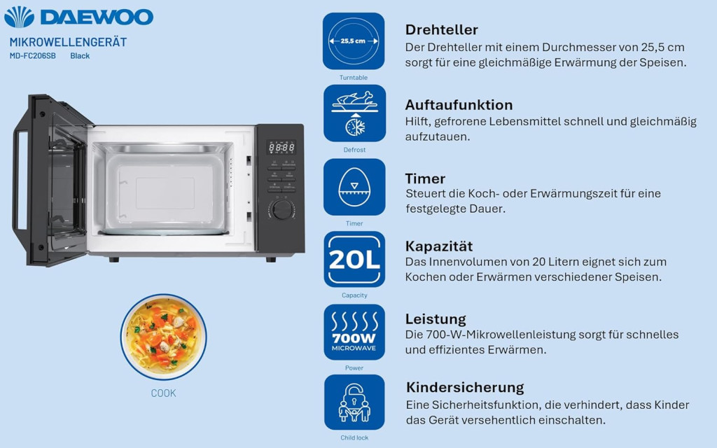Teljesítmény: 700 W. Űrtartalom: 20 liter. Teljesítmény fokozat: 5. Automatikus programok száma: 8. Grilffunkció. Időzítő. Gyerekzár. Digitális kijelző. Vezérlés: Mechanikus. Szín: Fekete.
