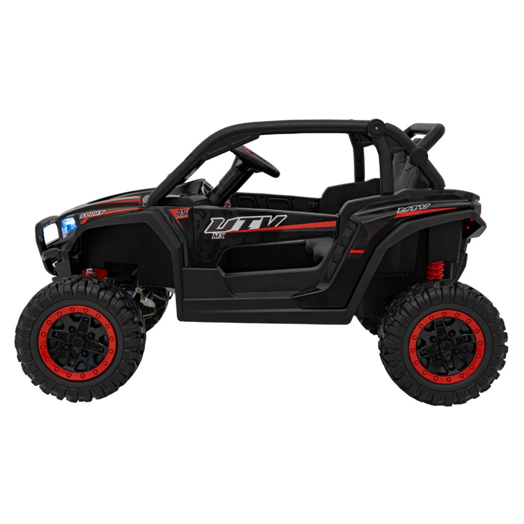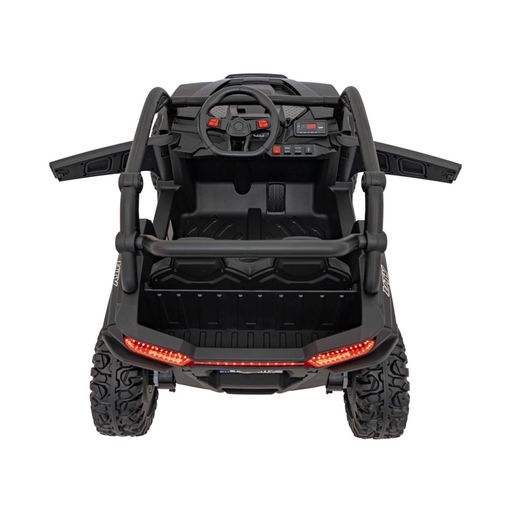 Motor: 4 x 50 W. Akkumulátor: 24V/7Ah. Sebességváltó: Lassú, gyors sebesség-gombbal kapcsolható. Sebesség: 3-7 km/h. Max. terhelés: 50 kg. Töltési idő: 10-12 óra. Fék: Automatikus fék, amikor a lábat felemelik a gázpedálról. Biztonsági övvel felszerelve. Ajtó nyitható.  Ülés: 2 személyes, műbőrKerekek: EVA. Távirányító: 2,4 GHz-es távirányító szülői felügyeleti funkcióval. Fények: Első-hátsó LED lámpa. Szín: Fekete.