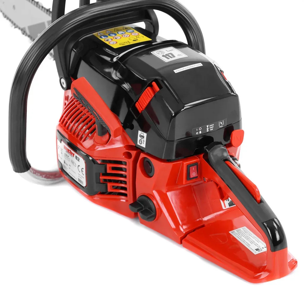 Hecht 62 benzinmotoros láncfűrész 2,9 kW 4 LE teljesítménnyel 8500 ford./percnél. A 45 cm hosszú láncvezetővel együtt a nehezebb feladatokkal is megbirkózik. A 62 cm³-es motortérfogat elegendő teljesítményt biztosít a kemény anyagok hatékony vágásához. A megfelelő formájú fogantyú lehetővé teszi a fűrész biztonságos és biztonságos tartását minden munkahelyzetben.A fűrész rezgéscsillapító rendszerrel van felszerelve, amely maximálisan elnyomja az erős motor okozta kellemetlen rezgések átvitelét a nyélre. Ezért a kezet nem terhelik túlzottan a rezgések, és sokkal kényelmesebb a munka. Nagy hangsúlyt fektettek a munkahelyi biztonságra. A fűrész biztonsági fékkel van felszerelve, és a lánc átlagos leállítási ideje a maximális sebességről 0,1 másodperc. Egy másik biztonsági elem a fűrész pár kioldóelemének elhelyezése a fő fogantyún, amelyek jelentősen csökkentik a láncváltó akaratlan elindításának kockázatát a motor indításakor. A fűrész acél fogtámaszsal van felszerelve, amely megfelelő használat esetén megakadályozza, hogy a fűrész kiugorjon a vágásból, ha ütések, például a lánc vágásba való bekapása okozta ütések esetén.