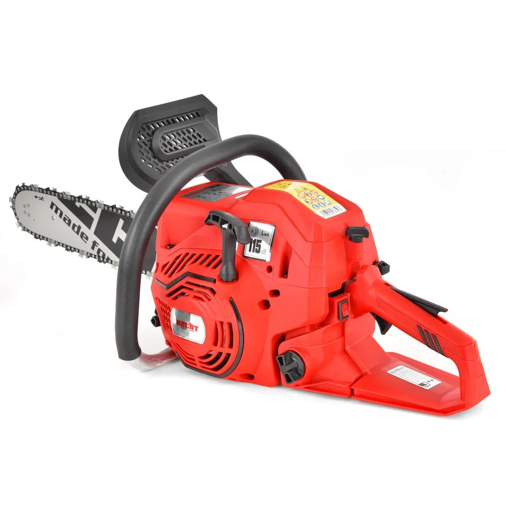 A hecht 954 benzinmotoros láncfűrész a hobbi és a félprofi felhasználók tökéletes választása, akik hatékony és tartós gépet keresnek tűzifa vágáshoz, kerti munkához vagy kisebb fakitermeléshez. Benzines láncfűrész 53,2 cm3 lökettérfogattal. 2,7 LE-s kétütemű motor. A fűrészt egy 40 cm hosszú HECHT láncvezetővel és egy 0,325" - 1,5 mm-es lánccal szállítjuk, 66 láncszemmel. A lánc típusjelzése HECHT 25Q66E. A lánc és a láncvezető kenését a vágás során automatikusan a fűrészbe integrált tartályból származó szivattyú biztosítja. A lánc sebessége 21,8 m/s. Nagy hangsúlyt fektettek a munkahelyi biztonságra. A fűrész biztonsági fékkel van felszerelve, és a lánc átlagos leállítási ideje a maximális sebességről 0,1 s. Egy másik biztonsági elem a fő fogantyún egy pár fűrész indítóelem elhelyezése, amely jelentősen csökkenti a véletlen indítás kockázatát a láncváltás a motor indításakor. A fűrész acél fogtámaszsal van felszerelve, amely megfelelő használat esetén megakadályozza, hogy a fűrész kiugorjon a vágásból olyan ütések esetén, amelyeket például a lánc beakadása okoz a vágásba.