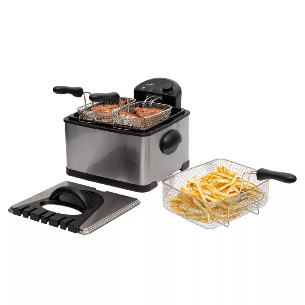 A Home olajsütő tökéletes megoldás mindazok számára, akik nagyobb mennyiségű ételt szeretnének gyorsan, biztonságosan és hatékonyan elkészíteni. Ez a kiváló minőségű, 2000 W teljesítményű készülék nemcsak megbízható működést kínál, de korszerű funkcióival és tágas sütőkapacitásával igazi élménnyé varázsolja az otthoni sütést legyen szó ropogós sültkrumpliról, frissensültekről vagy akár házi fánkról. A termosztát 115 és 190 °C között szabályozható, így a különböző ételekhez mindig megtalálható az ideális hőfok. A beépített visszajelző fények folyamatosan tájékoztatják a használót a készülék aktuális állapotáról, ezzel is növelve a sütés biztonságát és kényelmét. A 4-6 literes olajtartály ideális nagyobb családok vagy vendéglátók számára, hiszen egyszerre több adag étel is elkészíthető benne. A csomagban található 2 kisebb és 1 nagyobb nikkelezett sütőkosár segítségével különböző típusú ételek is süthetők egy időben például hal és zöldség anélkül, hogy az ízek keverednének. A készülékház és a fedél rozsdamentes acélból készült, amely nemcsak esztétikus megjelenést kölcsönöz, hanem ellenálló és időtálló is. A zománcozott sütőtér könnyedén kivehető, így a tisztítás egyszerű és gyors. A darabjaira szétszedhető kialakítás lehetővé teszi, hogy minden alkatrész külön tisztítható legyen, így higiénikusabb és hosszabb élettartamú a készülék. A fedélen található betekintőablak segítségével folyamatosan figyelhető az étel állapota anélkül, hogy ki kellene nyitni a fedelet. A kétrétegű szűrő pedig segít a szagok és a fröccsenő olaj minimalizálásában. A „cool touch”oldalfalakmég működés közben sem melegszenek túl, így védelmet nyújtanak az égési sérülésekkel szemben.