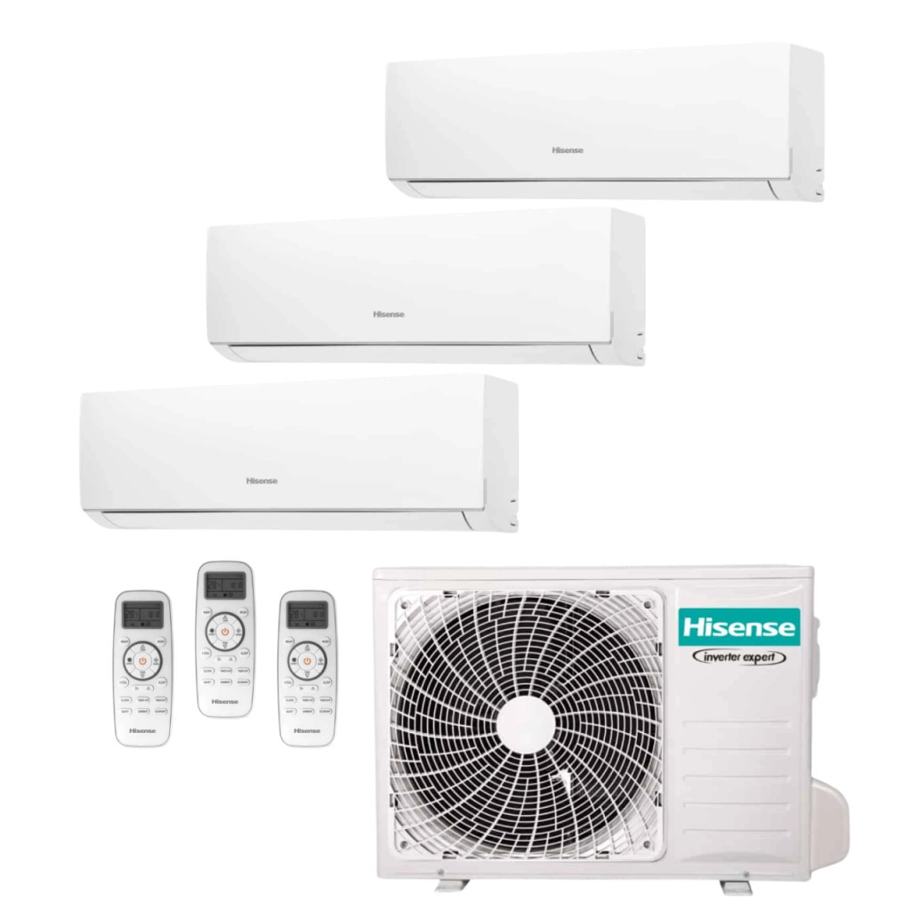 Multi split kültéri egység + 3 univerzális beltéri egység hűtésre-fűtésre. A Hisense multi split rendszerek ideálisak minden olyan esetben, amikor több helyiség klimatizálását szükséges megoldani mindössze egy kültéri egységgel. A multi split termékcsaládon belül szabadon variálhatók a beltéri egységek így nincs megoldhatatlan feladat. Ugyanazon rendszerben használhatók parapet mennyezeti, konzolos, légcsatornás, kazettás vagy hagyományos oldalfali beltéri egységek. A beltéri egységektől függően vezetékes vezeték nélküli távirányítók használhatók, illetve a WiFi kapcsolat is elérhető minden esetben. A kültéri egység beépített fűtőszállal rendelkezik, így extrém külső hőmérsékletek mellett is zavartalanul és energiahatékonyan teszi a dolgát.