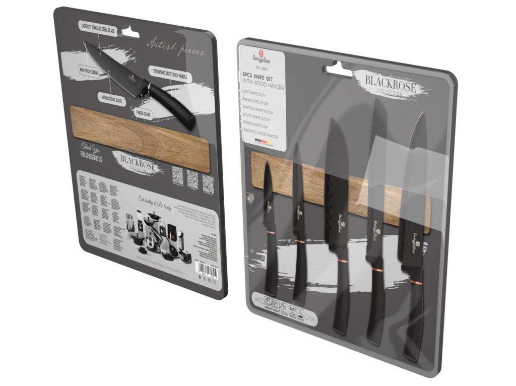 Berlinger Haus Black Rose Collection 6 részes késkészlet fa berakású mágneses fali tartóval. A Berlinger Haus rozsdamentes acélból készült kések pengéi tapadás mentes bevonatot kaptak, antibakteriálisak, nem foltosodnak és nem tartják meg az élelmiszerek szagát. A puha tapintású nyelek csúszásmentesek, biztonságosak. A mágneses tartó könnyen rögzíthető a falra, a kések biztonságos megtapadnak a felületen, helytakarékos és praktikus. PFOA mentes, ólommentes, kadmiummentes, környezetbarát.