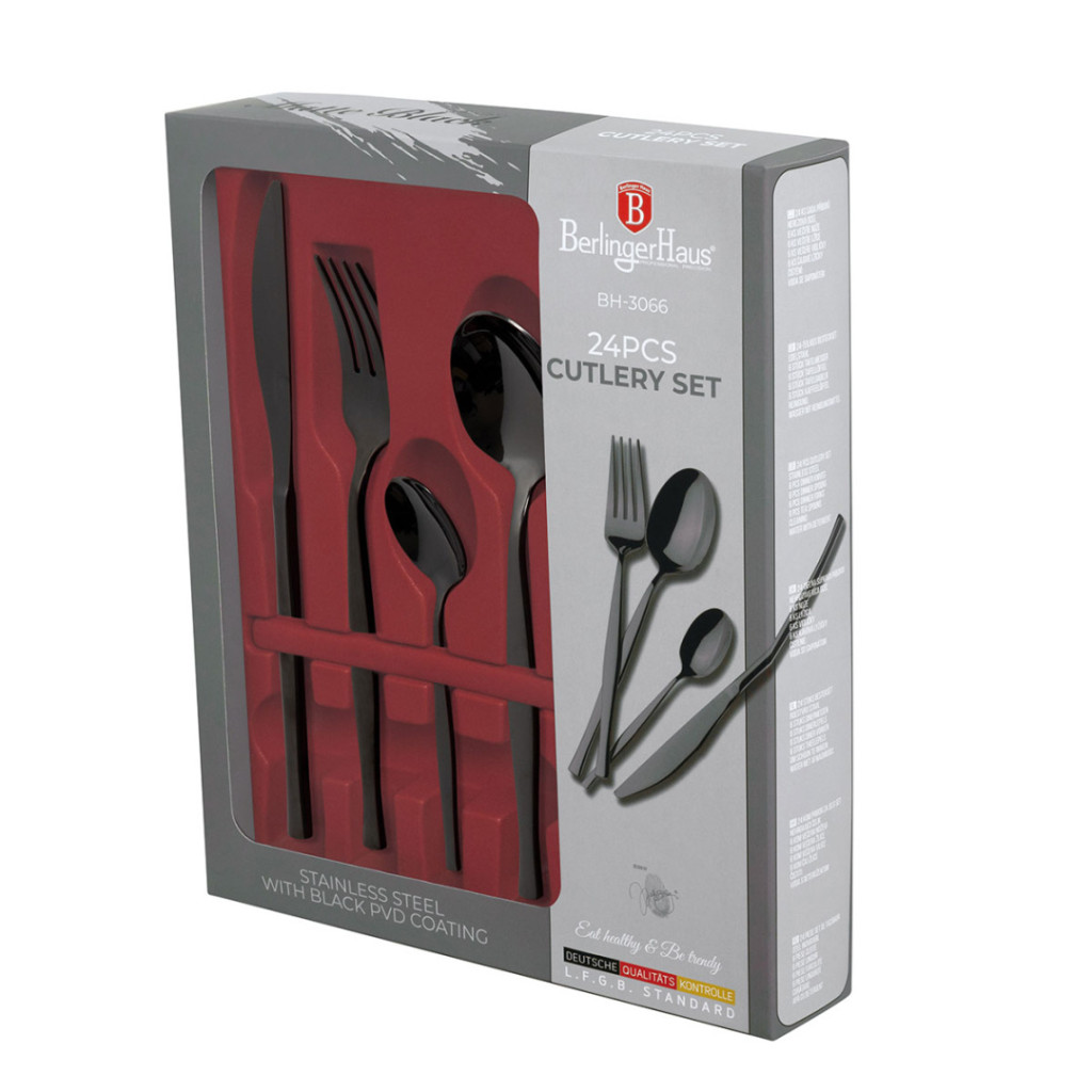 A 24 részes evőeszköz készlet a Matte Black Collection része, amely a modern konyhák elengedhetetlen kiegészítője. Ez a kollekció nemcsak funkcionális, hanem esztétikailag is lenyűgöző, így az evőeszközök nem csak a fiókban rejtőznek, hanem büszkén ki is állíthatók. A készlet rozsdamentes acélból készült, amely tükör fényes bevonattal rendelkezik. Ez a kombináció nemcsak tartósságot, hanem elegáns megjelenést is biztosít. A fekete PVD bevonat különleges megjelenést kölcsönöz az evőeszközöknek, miközben a tükör fényű bevonat eleganciát sugároz. Ez a kombináció biztosítja, hogy az evőeszközök bármilyen asztali dekorációval harmonizáljanak. Az evőeszközök elegáns kivitelezése és egyedi csomagolása garantálja, hogy minden étkezés különleges alkalommá váljon. A kiváló minőségű rozsdamentes acél és a fekete PVD bevonat kombinációja nemcsak esztétikai, hanem funkcionális előnyöket is kínál.
