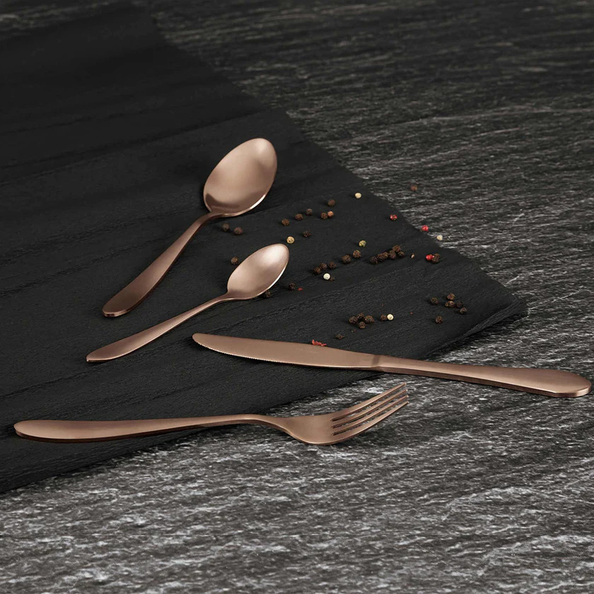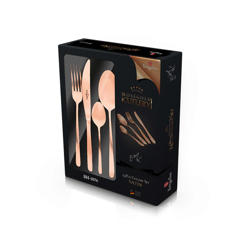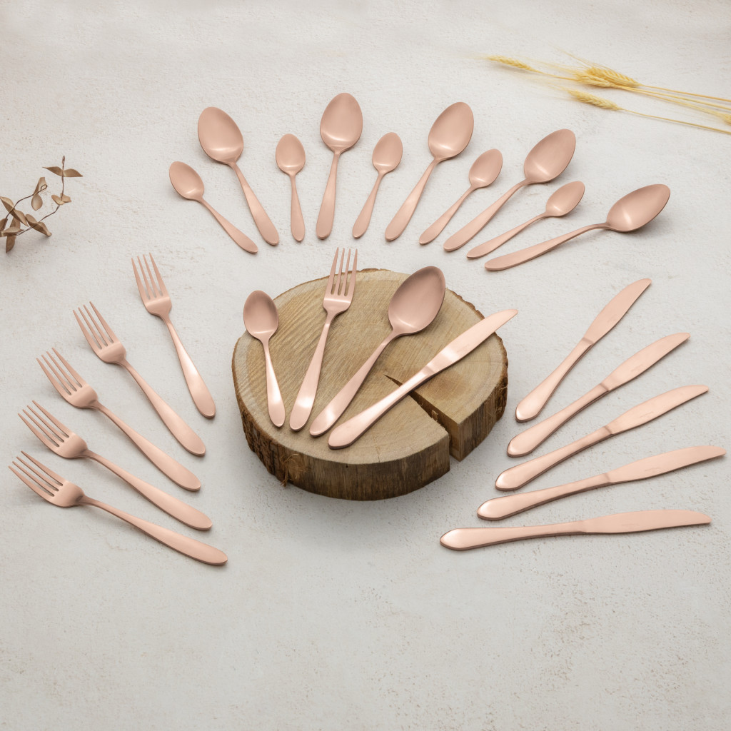 A 24 részes evőeszköz készlet a Black Rose Collection része, amely a konyhai eszközök világában a stílus és a funkcionalitás tökéletes egyensúlyát képviseli. Ez a gyönyörűen megtervezett készlet nemcsak a mindennapi étkezéseket teszi különlegessé, hanem bármelyik étkezőasztal dísze is lehet. A készlet rozsdamentes acélból készült, szatén bevonattal, amely nemcsak tartósságot, hanem elegáns megjelenést is biztosít. A rozsdamentes acél kiváló minősége garantálja, hogy az evőeszközök hosszú évekig megőrzik fényüket és formájukat. A különleges rose gold szín és az elegáns kivitelezés teszi ezt a készletet igazán egyedivé. A szatén fényű bevonat tovább fokozza a luxus érzetet, így az evőeszközök nemcsak funkcionálisak, hanem esztétikai élményt is nyújtanak. A készlet egyedi csomagolásban érkezik, amely nemcsak a tárolást könnyíti meg, hanem ajándékként is tökéletes választás lehet. A Black Rose Collection minden darabja harmonizál egymással, így bátran kihelyezhetők a konyhában vagy az étkezőben, nem kell őket a fiók mélyére rejteni.