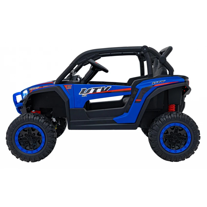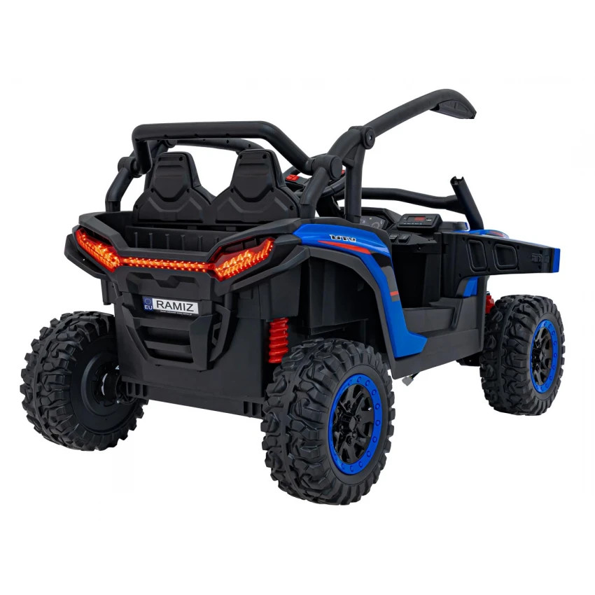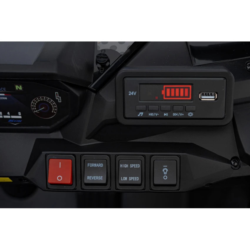 24 V-os jármű, 4 darab erős kerékmotorral, amely bírja a füvet, gyepet, kisebb emelkedőket. A jármű kapcsolható világító első és hátsó lámpákkal, valamint világító műszerfallal rendelkezik. Ezen kívül kürt, modern dallamok, MP3-USB-Bluetooth csatlakozás, hangerőszabályzó is izgalmassá varázsolja a kisautót a gyerekek számára. Indításkor felbőgő motorhang hallható, a kisautó fokozatosan gyorsul fel, amíg el nem éri a végsebességet, ami megszünteti a kellemetlen rántást induláskor valamint meghosszabbítja a motorok élettartamát. Az új, 2,4Ghz rendszerű távirányítón 3 sebességfokozat választható 3 sebesség előre-1 sebesség hátra. Az új generációs távirányítónak köszönhetően, az autó kisebb gyermekek számára is ajánlott! Puha habosított kerekek az EVA polimerből készített kerekek magas szín és szerkezeti stabilitással rendelkeznek. Mikroporózus szerkezetüknek köszönhetően defekttűrők. Főbb előnyei: puha, rugalmas mégis erős, szagtalan, UV álló, szívós, ellenáll mindenféle repedéseknek és töréseknek, vízálló. 2,4 GHz Szülői távirányító amely a konkrét autóhoz párosítható, ezért egyidejűleg bármennyi kisautó egymás zavarása nélkül távirányítóval működtethető.